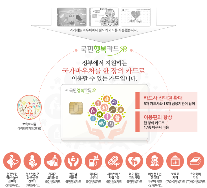 국민행복카드란 정부에서 지원하는 국가바우처를 한 장의 카드로 이용할 수 있는 카드입니다. 과거에는 기존에 사업별로 나뉘어있던 것을 하나로 통합해 현재는 한 장의 카드로 17종의 바우처를 이용할 수 있으며, 5개의 카드사와 18개 금융기관이 참여했습니다. 카드는 국민 누구나 발급 가능하며, 신용카드나 체크카드, 신용/체크카드 발급이 어려운 경우 예외적으로 전용카드를 발급받을 수 있습니다.