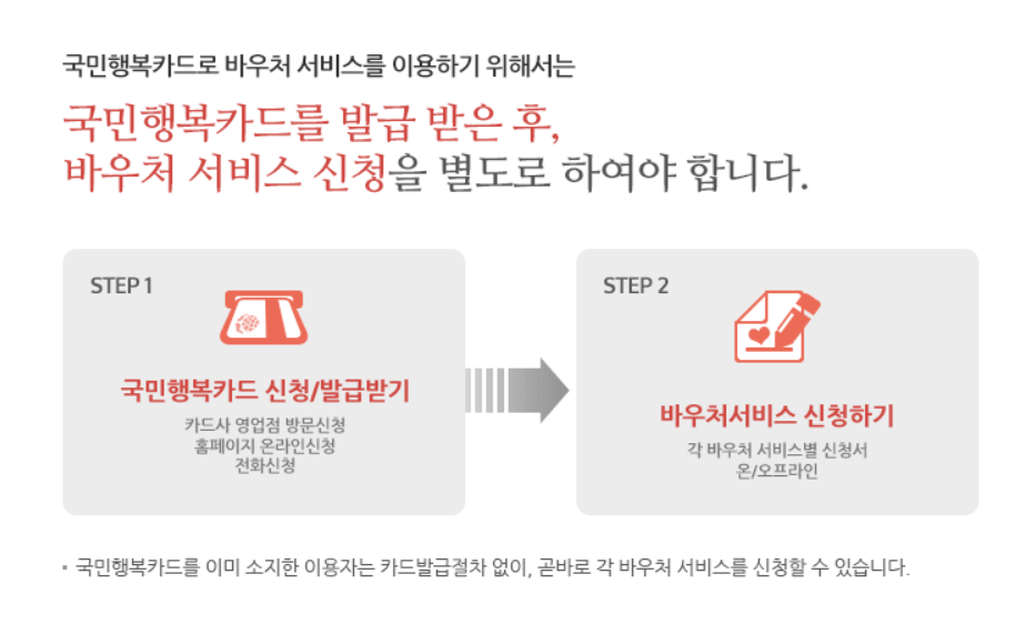 국민행복카드의 신청방법을 알려드리겠습니다. 먼저 국민행복카드를 방문 혹은 온라인, 유선으로 신청하고 발급을 받습니다. 그 후에 별도로 바우처 서비스를 대상자의 주민등록상 주소지 관할 읍·면·동 주민센터에서 신청을 합니다. 바우처 제공 가능한 기관에 전화 문의를 하신 뒤에 필요한 서류를 받아 가지고 가셔서 바우처 서비스와 국민행복카드를 신청하셔도 됩니다.