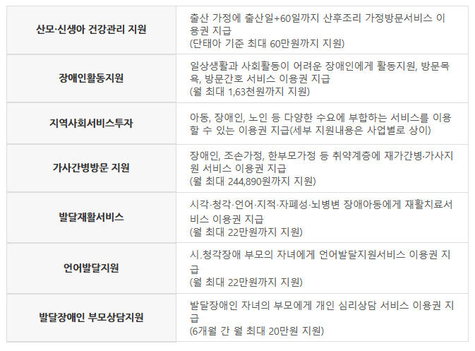 지금까지 국민행복카드와 사회서비스사업 두 가지 종류에 대해 알아보았습니다.
